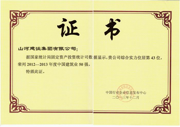 由國家統(tǒng)計(jì)局提供最新權(quán)威數(shù)據(jù)支持,中國行業(yè)企業(yè)信息發(fā)布中心主辦的“2013第十二屆中國建筑業(yè)50強(qiáng)測評成果發(fā)布暨頒獎(jiǎng)典禮”于2013年12月在京舉行。會上發(fā)布了中國建筑業(yè)50強(qiáng)名單,山河集團(tuán)位居第43名,提前兩年實(shí)現(xiàn)了山河集團(tuán) “二五”目標(biāo)中的該項(xiàng)指標(biāo)。