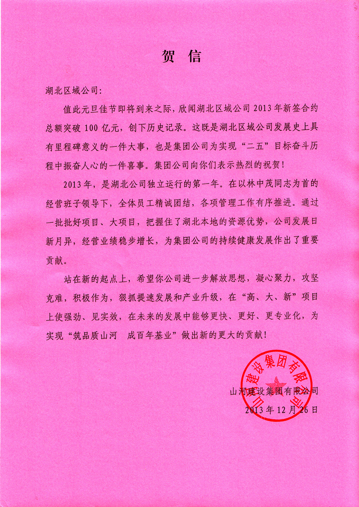 集團(tuán)公司特向湖北區(qū)域公司發(fā)來賀信表示祝賀,并期待湖北區(qū)域公司為實(shí)現(xiàn)“筑品質(zhì)山河 成百年基業(yè)”的企業(yè)愿景做出新的更大的貢獻(xiàn)!