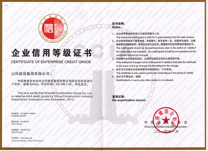 全國建筑業(yè)AAA級信用企業(yè)由中國建筑業(yè)協(xié)會頒發(fā),是建筑行業(yè)信用最高獎項。此次評價嚴(yán)格按照《建筑業(yè)企業(yè)信用評價試行辦法》規(guī)定的程序進(jìn)行。經(jīng)企業(yè)自愿申報、各地區(qū)和有關(guān)行業(yè)、建筑業(yè)協(xié)會推薦、在建設(shè)系統(tǒng)相關(guān)網(wǎng)站上排查、專家評價組初評、全國建筑業(yè)企業(yè)信用評價工作指導(dǎo)委員會審定和網(wǎng)上公示。通過層層篩選,最終,包括山河建設(shè)集團(tuán)有限公司在內(nèi)的93家企業(yè)評定為2013年度全國建筑業(yè)AAA級信用企業(yè)。