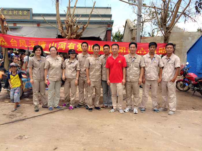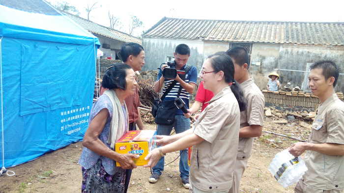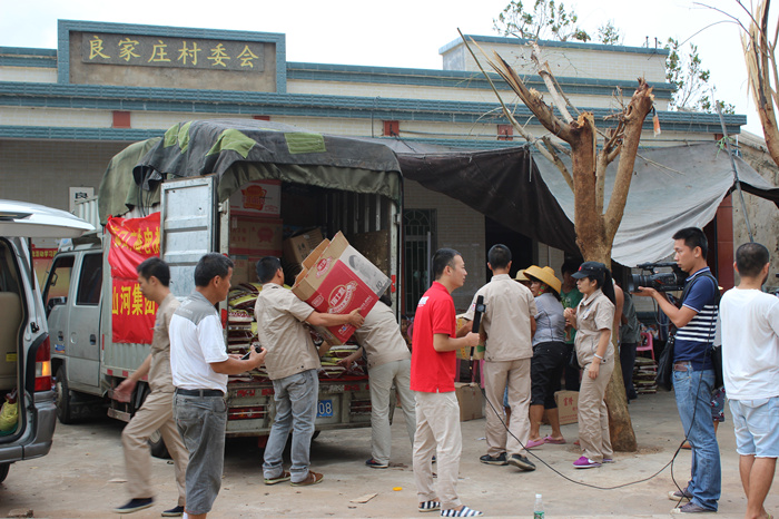 與此同時(shí),海南各地都是眾志成城的救災(zāi)場(chǎng)面,一方有難,八方支援。山河集團(tuán)在開展自救的同時(shí),心系災(zāi)民,當(dāng)?shù)弥貫?zāi)區(qū)文昌部分村鎮(zhèn),由于交通偏僻,信息不暢,得不到及時(shí)救助,災(zāi)民的生活非常的艱難時(shí),山河人心急如焚。山河集團(tuán)已進(jìn)駐海南6年,扎根海南、情系海南。在災(zāi)難面前,山河人勇于擔(dān)當(dāng),自發(fā)的組織捐款10萬余元,采購(gòu)了幾噸急需生活物資,如米、油、水、食品、藥品等。7月26日,在??跓釒Р?bào)記者的帶領(lǐng)下,公司組織員工來到了一線災(zāi)區(qū)文昌市錦山鎮(zhèn)良民村。 當(dāng)我們來到該村時(shí),村民已等待多時(shí),看到我們的到來非常的激動(dòng)。當(dāng)時(shí)下著大雨,村民們顧不上遮蓋自家的屋頂、收拾東西,都趕來搬運(yùn)救災(zāi)物資,雨水、汗水、淚水流淌在臉上,感激之情流淌在心間。在村長(zhǎng)的帶領(lǐng)下,我們見到了村里的低保戶年邁的阿婆,她老無所倚,幾年前她兒子去逝了,幾天前兒媳重病也去逝了,現(xiàn)只剩下小孫兒相依為命,臺(tái)風(fēng)又讓這個(gè)本來很不幸的家庭受到重創(chuàng),她們失去了僅有的一間住所,現(xiàn)寄住在只有幾個(gè)平方的一個(gè)臨時(shí)的帳篷里,當(dāng)我們把米、油等物資送到阿婆的手中時(shí),她熱淚盈眶,緊握我們的雙手,不停的道謝,看到老人的悲痛淚水,我們不禁心酸,淚水打濕了眼眶。我們鼓勵(lì)她建立對(duì)生活的信心,同時(shí)也希望社會(huì)給予她更多的關(guān)愛,讓她的晚年生活無憂。