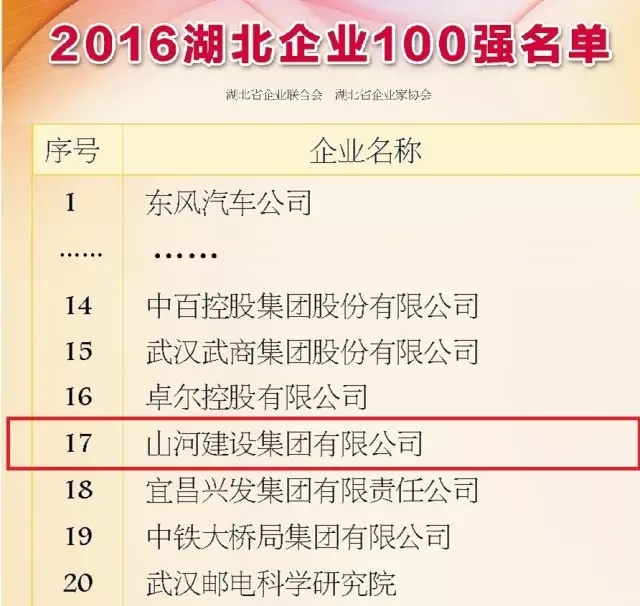 9月8日,2016湖北企業(yè)100強(qiáng)發(fā)布,東風(fēng)汽車、中建三局、武鋼集團(tuán)位居前三甲,山河集團(tuán)以304.85億元的營(yíng)業(yè)收入排名第17位,榮登湖北企業(yè)百?gòu)?qiáng)榜。