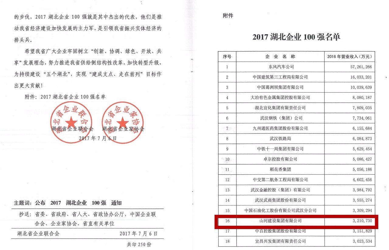 “荊楚風(fēng)云匯,百強(qiáng)戰(zhàn)鼓擂”。7月6日,湖北省企業(yè)聯(lián)合會、湖北省企業(yè)家協(xié)會發(fā)布“2017湖北企業(yè)100強(qiáng)”榜單。山河集團(tuán)2016年度以營業(yè)收入321.073億元的實(shí)績名列2017湖北企業(yè)100強(qiáng)第16位,較去年第17位又上升了1位。
