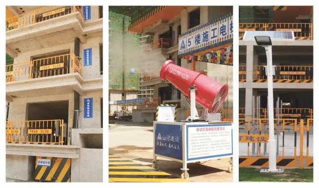 標(biāo)準(zhǔn)化的綠色施工。為減少揚塵污染,項目部進(jìn)行大面積綠化,同時還對施工道路、車輛定期進(jìn)行沖洗處理,建立了樓層垃圾清運管道系統(tǒng)、外架噴淋系統(tǒng),使用防塵霧炮抑塵,施工用水進(jìn)行循環(huán)利用等。