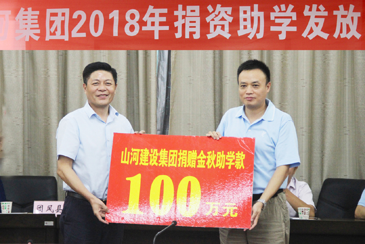 8月27日,山河集團2018年“山河扶貧助困教育基金”捐贈活動在團風縣政府七樓會議室舉行。當天,山河集團出資100萬元,資助團風縣百余名貧困大學生走進學堂??h人大常委會主任杜泉源,縣政協(xié)主席易大安,縣委常委、縣委辦主任丁永忠出席,副縣長黃菊花代表縣政府接過寫有“山河扶貧助困教育基金100萬元”的牌匾。