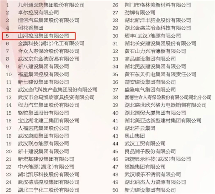 榜單顯示,九州通醫(yī)藥集團(tuán)、卓爾控股、恒信汽車(chē)集團(tuán)、稻花香集團(tuán)分別位列前四名,山河集團(tuán)名列第五位。