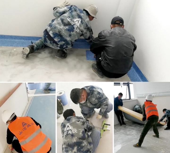 施工現(xiàn)場(chǎng),多類工種各司其職,搶抓建設(shè)。突擊隊(duì)到達(dá)后,承擔(dān)起醫(yī)院住院大樓的部分地面鋪裝任務(wù),需要鋪裝地板膠的面積約3600平方米。分配好工作任務(wù),大家立即投入到緊張的施工中,清潔地面、檢測(cè)地坪、預(yù)鋪裁割、上膠、滾壓,每一道工序都一絲不茍。時(shí)間緊、任務(wù)重,那就加班加點(diǎn),即使再苦再累,也要按照時(shí)間節(jié)點(diǎn)保質(zhì)保量完成施工目標(biāo),這是山河人一貫的作風(fēng)。