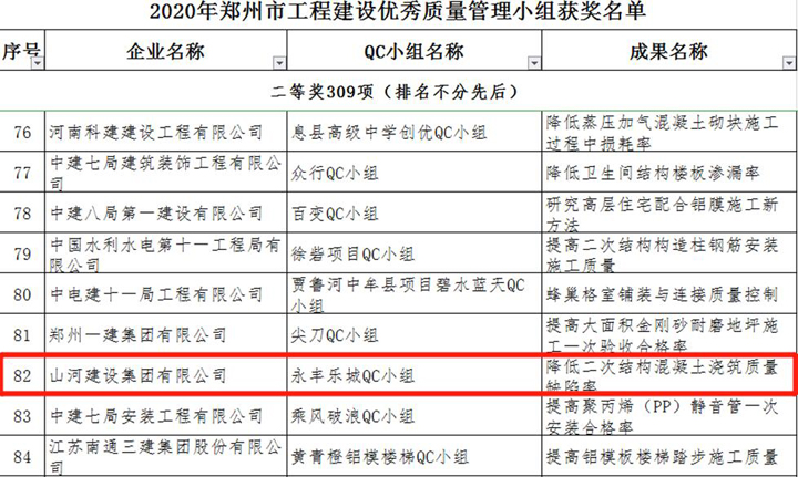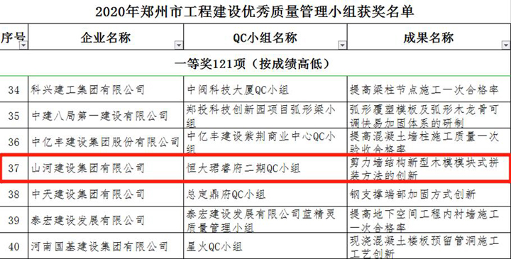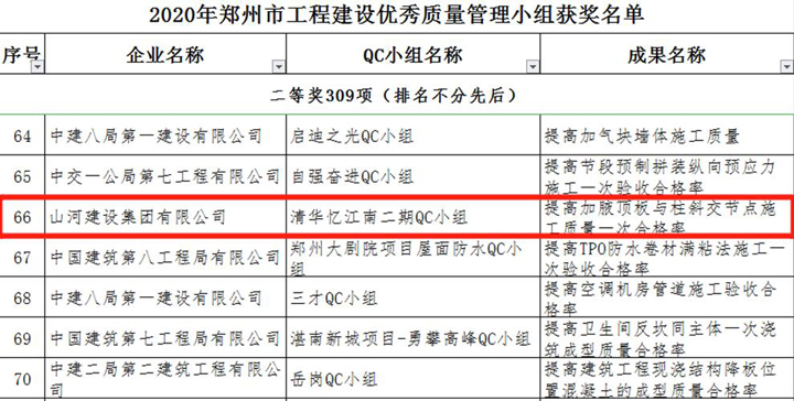3月23日,鄭州市建筑業(yè)協(xié)會發(fā)布《關(guān)于表彰2020年鄭州市工程建設(shè)優(yōu)秀質(zhì)量管理小組活動成果的通知》,山河建設(shè)集團(tuán)河南公司申報(bào)的三項(xiàng)成果榜上有名,恒大珺睿府二期QC小組獲得一等獎(jiǎng),清華憶江南二期QC小組、永豐樂城QC小組分別獲得二等獎(jiǎng)。
