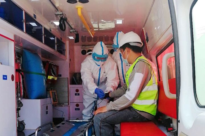 救護車閃著紅燈呼嘯而來,醫(yī)護人員對疑似感染人員進行了初步的體溫、血氧、血壓等檢查后,將其送到鄂鋼醫(yī)院進行詳細檢查。