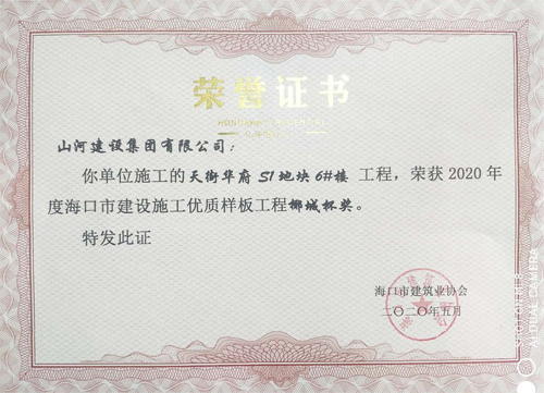5月13日,山河建設(shè)集團(tuán)海南公司承建的天街華府S1地塊6#樓喜獲2020年度??谑薪ㄔO(shè)施工優(yōu)質(zhì)樣板工程“椰城杯”獎(jiǎng)項(xiàng),這是海口市建設(shè)工程質(zhì)量最高榮譽(yù)。