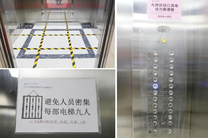 物業(yè)服務(wù)中心加強(qiáng)對(duì)進(jìn)出車輛的管控,大廈地庫通往寫字樓的進(jìn)出口暫時(shí)封閉,所有人員均須經(jīng)大堂出入,同時(shí)出入口分開設(shè)置。大廈一樓開辟了快遞外賣自提區(qū),減少人員近距離接觸,電梯實(shí)行“分區(qū)分層”管控,嚴(yán)格限制搭乘人數(shù),轎廂每小時(shí)固定消毒,規(guī)避潛在的交叉感染可能。