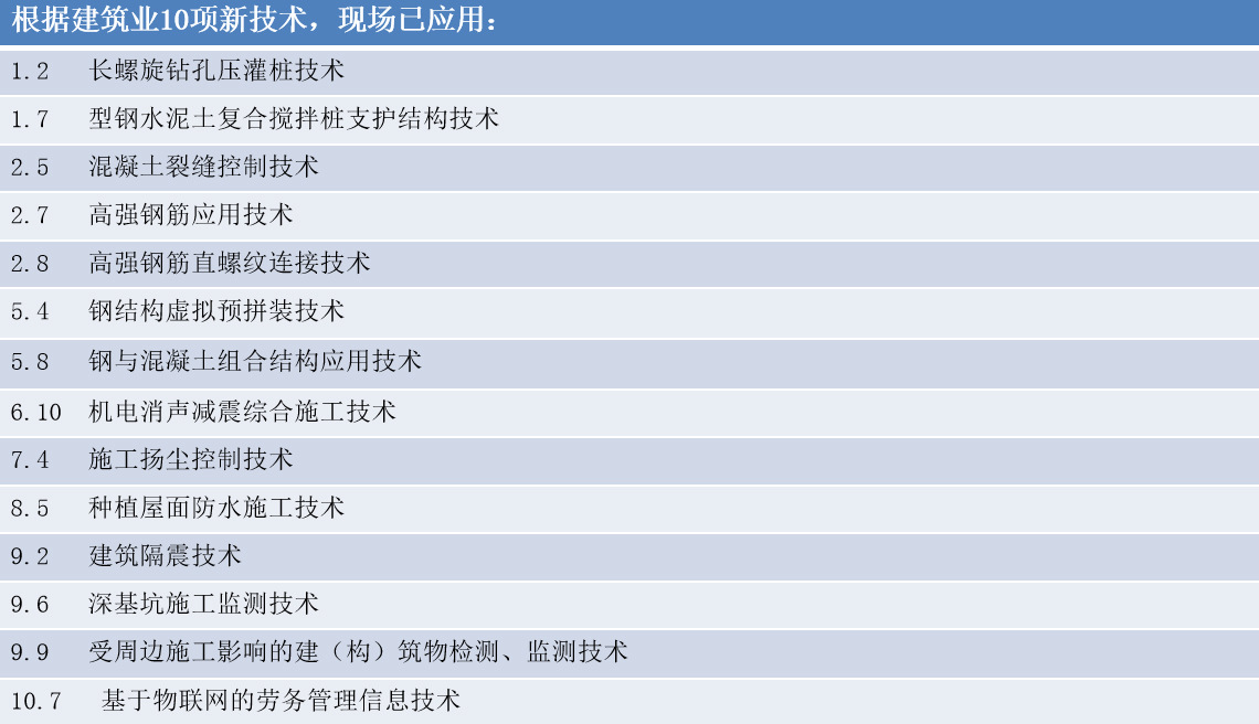 開工伊始,項(xiàng)目部建立了新技術(shù)應(yīng)用管理體系,從組織上保證新技術(shù)推廣應(yīng)用順利實(shí)施,同時根據(jù)現(xiàn)場實(shí)際情況把新技術(shù)應(yīng)用項(xiàng)目進(jìn)行分解,落實(shí)至班組,責(zé)任到人。施工過程中,該項(xiàng)目先后應(yīng)用了長螺旋鉆孔壓灌樁技術(shù)、型鋼水泥土復(fù)合攪拌樁支護(hù)結(jié)構(gòu)技術(shù)、混凝土裂縫控制技術(shù)、高強(qiáng)鋼筋應(yīng)用技術(shù)等十余項(xiàng)建筑業(yè)新技術(shù)。海南公司工程部定期到現(xiàn)場進(jìn)行檢查、驗(yàn)收和指導(dǎo),確保新技術(shù)應(yīng)用落到實(shí)處,見到實(shí)效。