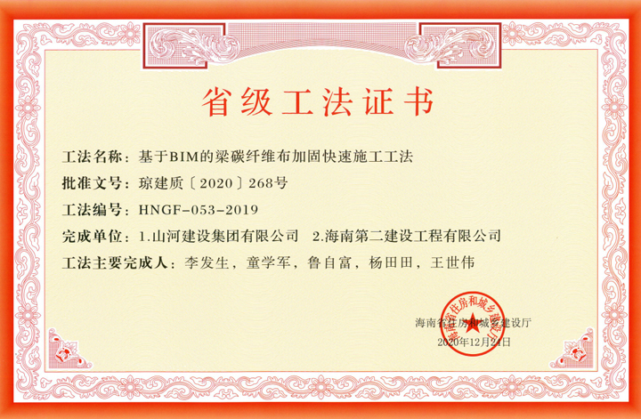 近日,海南省住房和城鄉(xiāng)建設(shè)廳公布了《2019年度海南省工程建設(shè)工法名單》,山河建設(shè)集團海南公司申報的《基于BIM的梁碳纖維布加固快速施工工法》成功獲評。