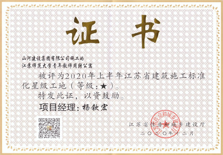 近日,從江蘇省住房和城鄉(xiāng)建設(shè)廳傳來喜訊,山河建設(shè)集團(tuán)江蘇公司承建的江蘇師范大學(xué)青年教師周轉(zhuǎn)公寓工程被評(píng)為“2020年上半年江蘇省建筑施工標(biāo)準(zhǔn)化星級(jí)工地”,再添一項(xiàng)省級(jí)榮譽(yù)。