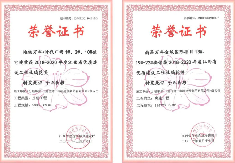 近日,江西省住房和城鄉(xiāng)建設廳發(fā)布《關于表彰2018-2020年度江西省優(yōu)質(zhì)建設工程獎獲獎工程的通報》,山河建設集團江西公司承建的地鐵萬科·時代廣場、萬科金域國際項目雙雙獲得江西省優(yōu)質(zhì)建設工程杜鵑花獎。
