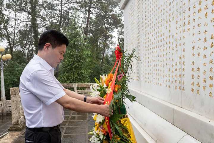 走過149級(jí)長(zhǎng)長(zhǎng)的臺(tái)階,雄偉莊嚴(yán)的革命烈士紀(jì)念碑映入眼簾。集團(tuán)兩名黨員代表抬著花籃緩步向前,擺放到紀(jì)念碑基座上,黨委書記程理財(cái)上前仔細(xì)整理緞帶,全體黨員向烈士紀(jì)念碑深深鞠躬,表達(dá)了無限的敬意與懷念。天空中的雨簌簌而下,如泣如訴,也在為烈士致哀。
