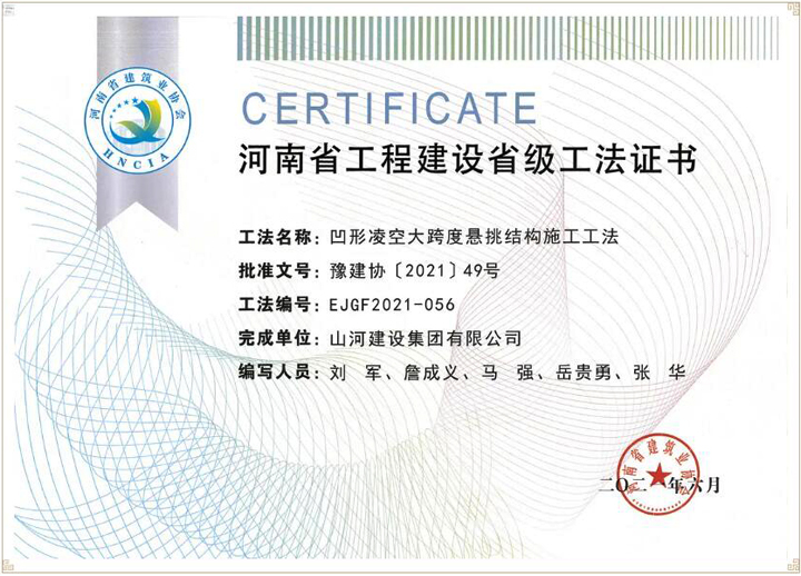 近日,河南省建筑業(yè)協(xié)會公布了《2021年度第一批河南省省級工法名單》,山河建設(shè)集團河南公司申報的《凹形凌空大跨度懸挑結(jié)構(gòu)施工工法》成功入選,被認定為河南省工程建設(shè)省級工法。