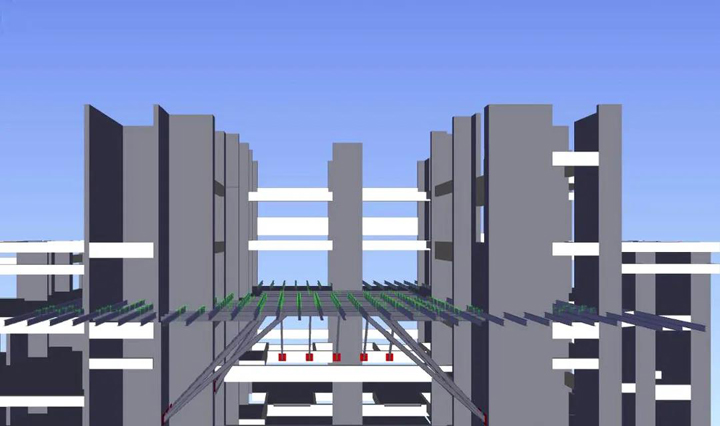 凌空大跨度懸挑結(jié)構(gòu)是目前較為流行的建筑結(jié)構(gòu)類型之一,帶來強烈視覺沖擊力的同時,也給工程施工帶來了巨大挑戰(zhàn)。由于跨度大、荷載復(fù)雜,對施工平臺的要求較高,高空作業(yè)的安全隱患也隨之增加。河南公司工程團隊在平頂山恒大珺睿府項目施工中,以屋面花架施工為依托,針對凹形凌空大跨度懸挑結(jié)構(gòu)(凹形兩側(cè)為樓梯間+電梯井形式)的施工進行課題攻關(guān),總結(jié)出了凹形凌空大跨度懸挑結(jié)構(gòu)施工工法。