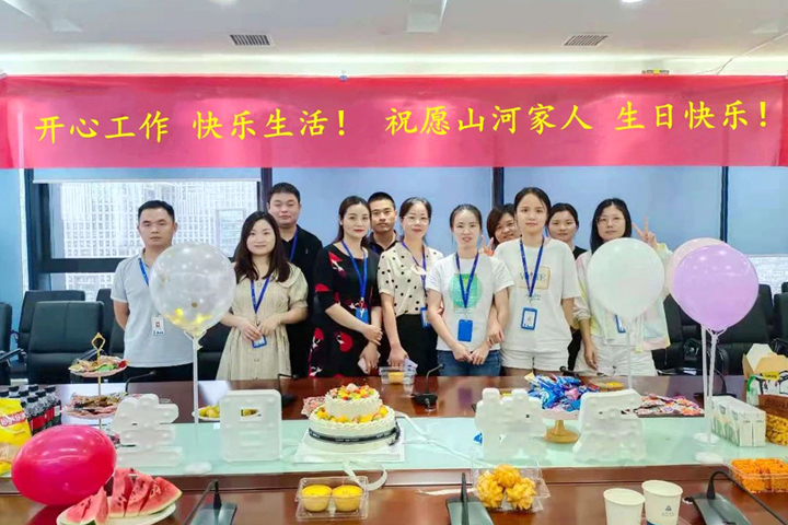 “開心工作,快樂(lè)生活!祝愿山河家人生日快樂(lè)!”生日會(huì)現(xiàn)場(chǎng),紅色的橫幅格外醒目,氣球、彩帶點(diǎn)綴其間,豐富的水果零食擺得滿滿當(dāng)當(dāng)。在歡快的音樂(lè)聲中,活動(dòng)正式開啟。