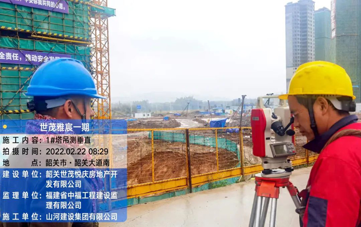 韶關世貿(mào)雅宸一期項目技術(shù)人員在測量塔吊垂直度