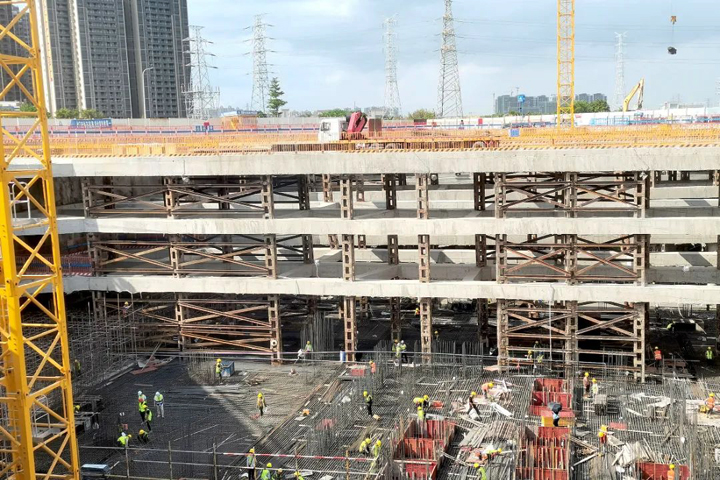 ▲中山農(nóng)商銀行項目施工人員進行負3層地下室底板鋼筋綁扎