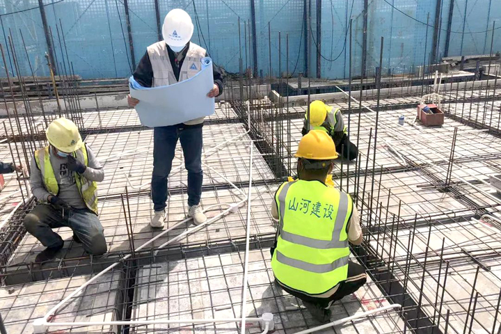 ▲鄭州金地拾光春曉園項目管理人員現(xiàn)場核對鋼筋