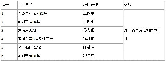2008年4月9日,《湖北日?qǐng)?bào)》第六版專版刊登《湖北省建設(shè)工程質(zhì)量安全協(xié)會(huì)公告》。根據(jù)《湖北省建筑結(jié)構(gòu)優(yōu)質(zhì)工程評(píng)審辦法》,湖北省建設(shè)工程質(zhì)量安全協(xié)會(huì)組織開展了2007年度省建筑結(jié)構(gòu)優(yōu)質(zhì)工程評(píng)選活動(dòng),經(jīng)對(duì)申報(bào)工程初審、核查和省建筑優(yōu)質(zhì)工程評(píng)審,全省有323項(xiàng)工程榮獲2007年度湖北省建筑結(jié)構(gòu)優(yōu)質(zhì)工程獎(jiǎng),其中,山河集團(tuán)有光谷中心花園、東湖壹號(hào)、黃埔東宮、漢府?國(guó)際公館等6項(xiàng)工程獲此獎(jiǎng)項(xiàng)。具體如下表: