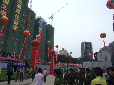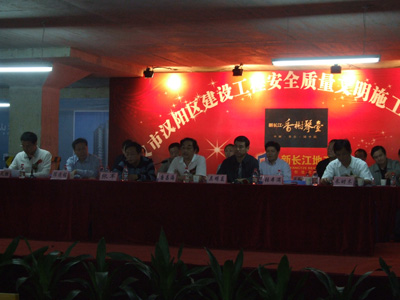 秋風送爽、彩旗飄揚,漢陽區(qū)2008年度建設工程安全質(zhì)量文明施工現(xiàn)場觀摩會于9月27日在我公司香榭琴臺項目經(jīng)理部隆重召開。出席此次會議的領導有:武漢市委副秘書長唐昌海;漢陽區(qū)委常委、副書記吳明益;漢陽區(qū)委常委、副區(qū)長張  軍;漢陽區(qū)委常委、宣傳部長張本滿;漢陽區(qū)人大副主任朱時木;漢陽區(qū)政協(xié)副主席馮從捌;武漢市建委建管辦副主任賈巾戈;武漢新區(qū)指揮部工程建設部部長賴成林;武漢市建設工程安全站站長邱濟彪;武漢市建設工程市場站副站長王偉震;武漢市建設工程質(zhì)監(jiān)站副處長李克平;漢陽區(qū)文明委主任甘瓊;漢陽區(qū)安監(jiān)局局長范俊華;漢陽區(qū)建設局黨委書記陳雙喜;漢陽區(qū)建設局局長熊成明;漢陽區(qū)建設局副局長、建管站站長王輝友等。出席此次會議的還有:各區(qū)建管部門領導、漢陽區(qū)在建工程的建設、施工、監(jiān)理單位代表共計五百余人參加了本次活動。