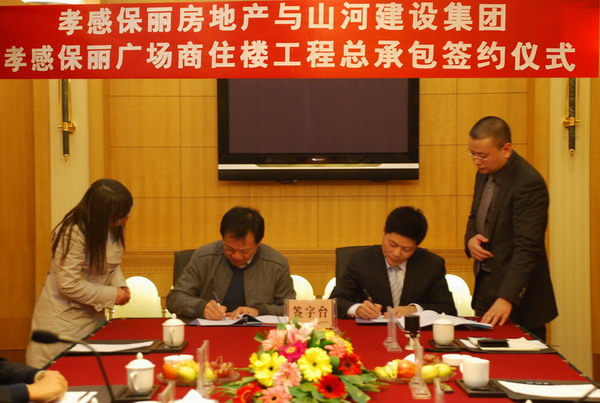 2009年11月23日下午5時,在美麗的東湖之濱,孝感保麗房地產(chǎn)與山河建設集團舉行了“孝感保麗廣場工程”總承包簽約儀式。